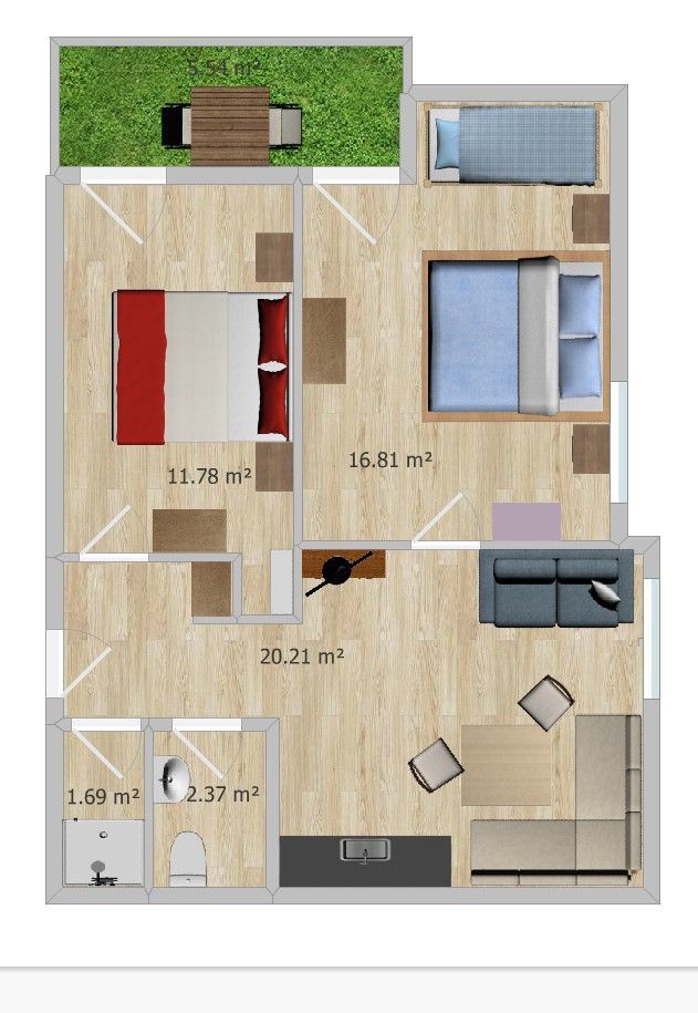 Die Wohnung besteht aus einer Wohnküche, 2 Schlafzimmern (1 Zimmer mit Doppelbett / 1 Zimmer mit Doppelbett und Etagenbett für Kinder), Badezimmer, Toilette und Balkon.
